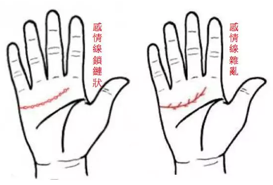 爱情线是手掌的三条明晰纹中最上面的那一条,若爱情线紊乱或出现锁链状,代表你的爱情之路比较崎岖,终身比较重情,会为爱情所苦。爱情线若延伸至食指与中指间,则代表你在面对爱情时成熟慎重,会设身处地为对方考虑,为人真诚。