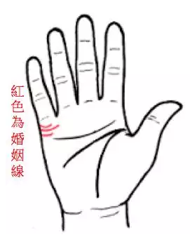 婚姻现在小指下的掌边,介於小指与爱情线之间。有的人只要一条婚姻线,若是婚姻线明晰丶水平延伸,代表能得圆满姻缘。有的人婚姻线有数条纹理,但数量并不是重点,请你两只手都看,会找到一条比较深的纹理,那就是你的婚姻线,若婚姻线有其他杂纹搅扰,要小心婚姻较简单有曲折。若同一只手有两条婚姻线一样深,或许简单堕入三角联系。