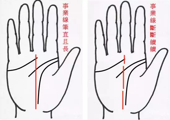 作业线是在手掌中心,从手的底部往上升的纹理,理想的作业线是直抵中指根部,中心无断。若你的作业线不是一条直线,而是时断时续的好几条,则代表你终身的作业不稳定,或经常变化作业环境。若你有两条作业线,则代表能够兼职或发展副业。