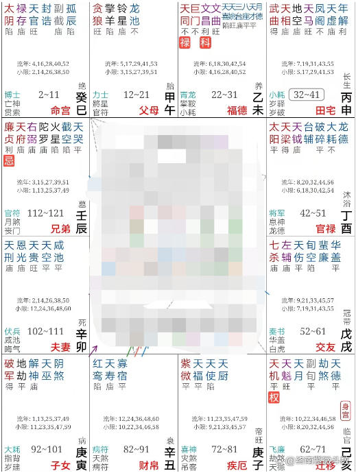 我们看32-41这十年,大运命宫双忌冲交友,大运夫妻宫冲本命夫妻,也冲交友,也就是婚姻出现大动荡的时间,二人就要分道扬镳,具体往下指向流年即可。