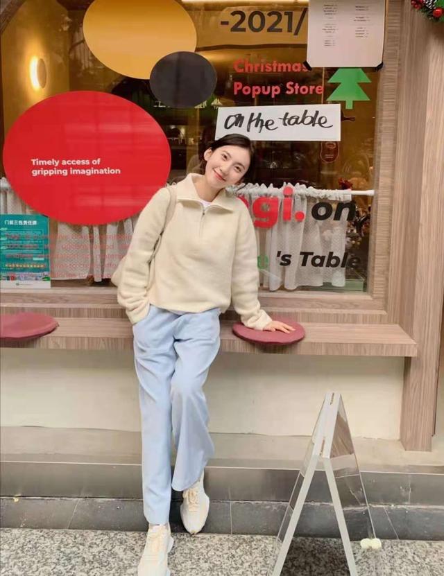 穿上暖fufu的奶白色毛衣,搭配浅蓝色的阔腿裤就是蓝天白云穿在身上,低饱和度的颜色在春天真的太治愈了。