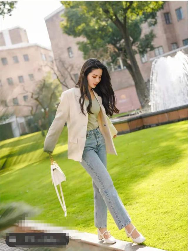 look4 奶茶色薄西装 内搭抹茶绿圆领衫 浅色牛仔裤
