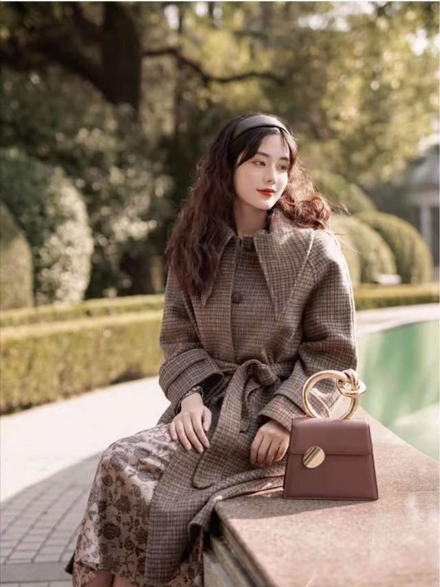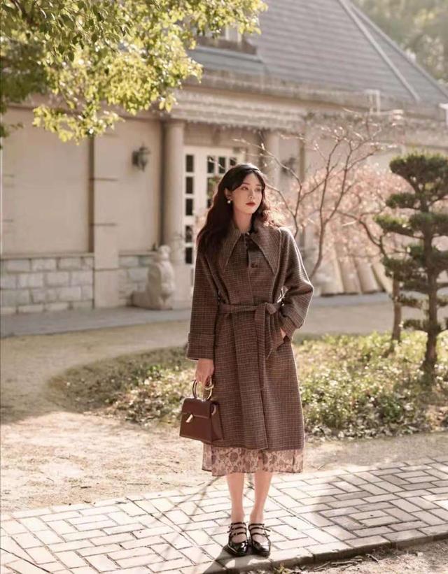 咖色法式格纹的大衣加上黑白欧式印花裙,意外地擦出了复古的火花,穿搭的整体色调都是红褐色的,比较温暖也比较优雅,在大衣里穿了一条宫廷花纹的复古连衣裙,露出裙摆让色彩上更有层次感,配合复古感的发型肯定是蓬松的鸡蛋卷,真的好显发量。