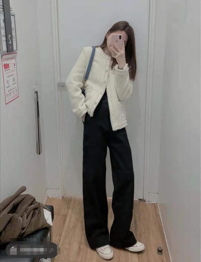 很温柔的白色小香外套,春天穿太优雅了,感觉春节或者情人节穿既有气场又有些女人味敲好看。内搭了黑色打底衫, 低领设计很好看,下装搭配的黑色裤子超级百搭显瘦, 直筒真的好看显瘦气场很足,。