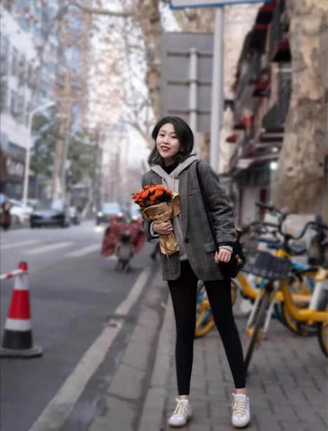 这件西装比较薄,是羊毛的厚款西装外套,在不需要穿羽绒服的天气可以当成冬天过渡春天的外套穿。内搭了灰色的连帽卫衣,卫衣属于是耐看百搭简答的款式,在卫衣里面还穿了黑色的中高领毛衣打底,下装选择了黑色的打底裤和德训鞋进行搭配。这套look呢非常日常简单,穿着舒服又好看。