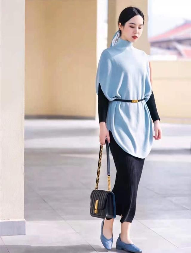 look2 奶蓝色半高领针织衫 黑色针织连衣裙