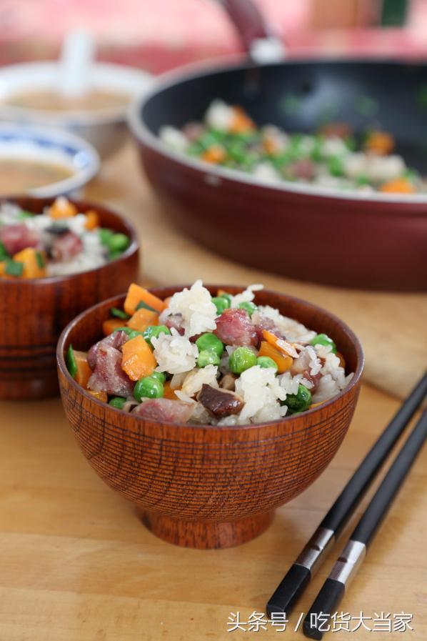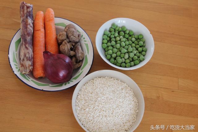 质料:糯米300克、豌豆100克、腊肠80克、胡萝卜120克,香菇十朵,洋葱80克