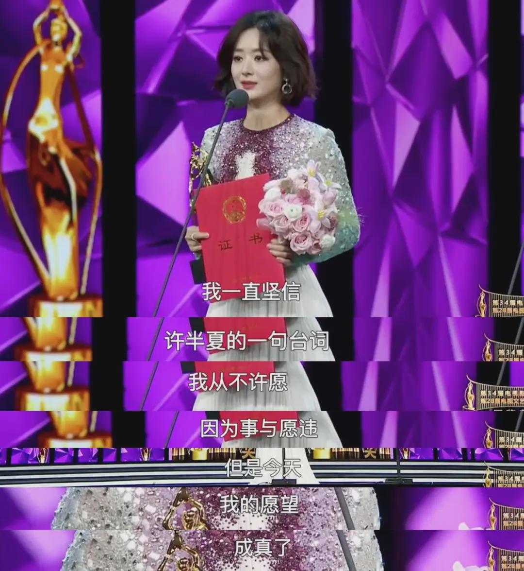 这一次捧起“视后”的奖杯。她说:“我一直坚信许半夏的一句台词‘我从不许愿,因为事与愿违’,但今天我的愿望成真了。”