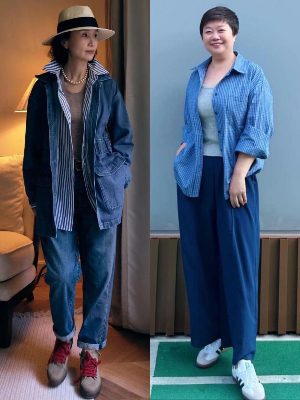 在所有的亮色中,相信蓝色是最受大龄女性喜爱的,由于蓝色自带一种清冷又高级的感觉,因此,相对来说比较百搭,而且不同饱和度的蓝色呈现的感觉也有所不同。