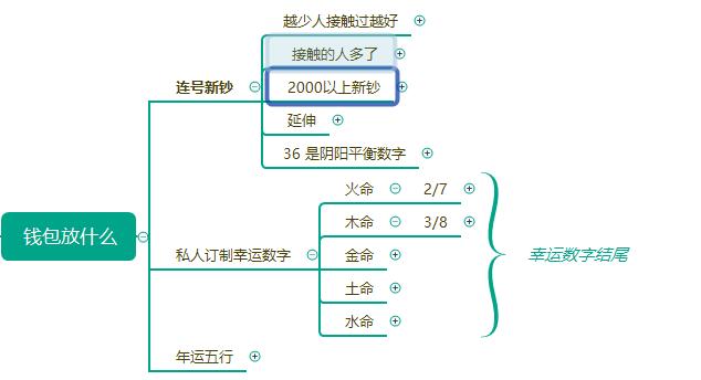 钱包里要放自己Lucky连号新钞,新钞得单独放一层,而且是雷打不动不能用的。那你就得问了什么是自己私人订制Lucky数字呢?这里就涉及到河图洛书(在此不深讲,需要系统地去学习)通过洛书大家可以知道自己是属什么命的?对应导图中五行中的命有对应的幸运数字。举例:霞姐是木命,幸运数字就是以3/8结尾,那我可以选择连号新钞是3300/3800/6300,8的能量是3的一倍,所以霞姐幸运数字是以8结尾就是3800;