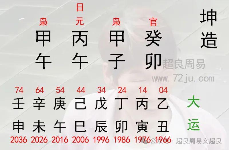 她这个命出生于癸卯年甲子月丙午日,我个人拟定她为甲午时出生。理由一是按她的大运来看,她应该是身旺的八字。