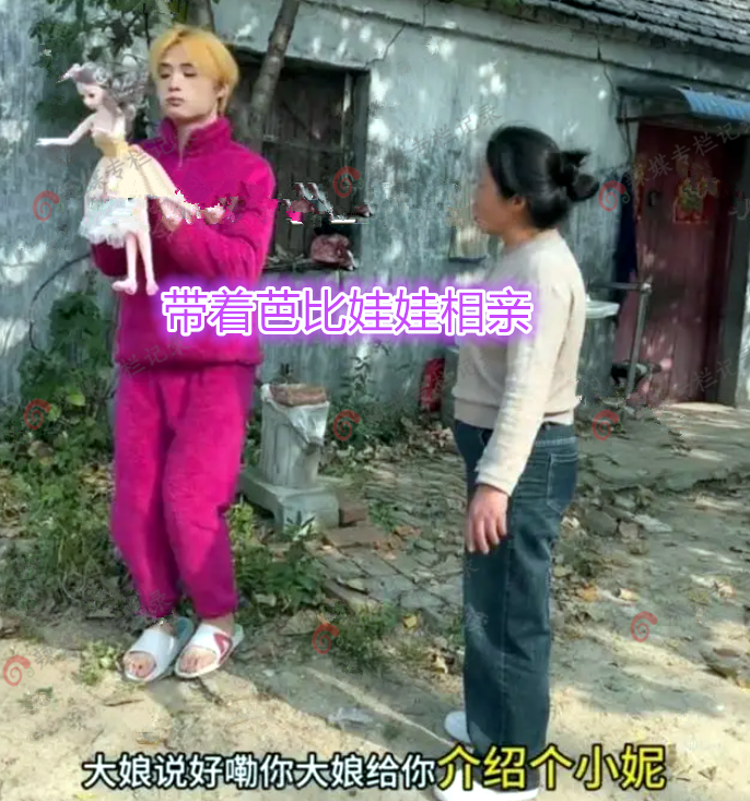 在视频中看到,一名男子穿着粉红色的睡衣,穿着可爱的拖鞋,怀里抱着一个芭比娃娃,非要这个打扮去相亲,媒人看到后,拒绝带着男子去,并且还带着男子去找男子的母亲