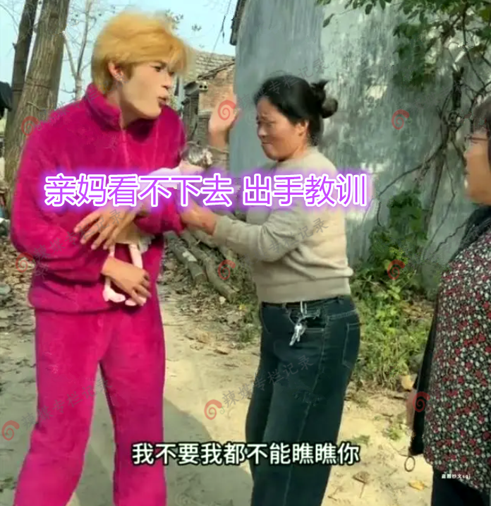 媒人听到女方这样讲,就回到村里,在村口看到了男子被母亲追着打,男子的母亲说“你看看你还像个小伙子吗,打扮的比大姑娘还花哨,染着黄毛,穿着大粉色的睡衣,这个形象谁愿意和你谈恋爱”