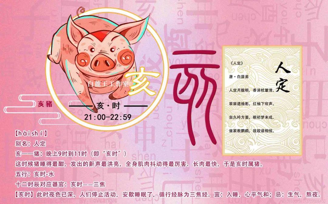 据说这时候猪睡得最香甜,发出鼾声最响亮,是为亥时,所以有亥猪。人定,也是人静,这时候应该安抚心情,切勿心浮气躁,好好休息。