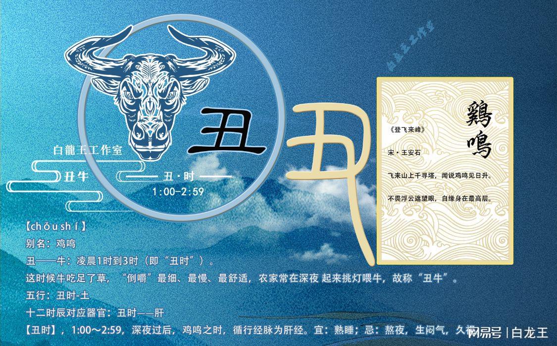 丑时是十二时辰的第二个时辰,对应24小时时间为01:00-2:59,是子时后面的时辰,寅时前面的时辰,古时又名鸡鸣,荒鸡。“鸡鸣”字面上有“鸡叫”之意,但它在十二时辰中却是特指夜半之后、平旦以前的那一时段,即深夜过后的1至3时,以地支来称其名则为丑时。鸡被古人褒称作“知时畜也”,“守夜不失时,信也。”