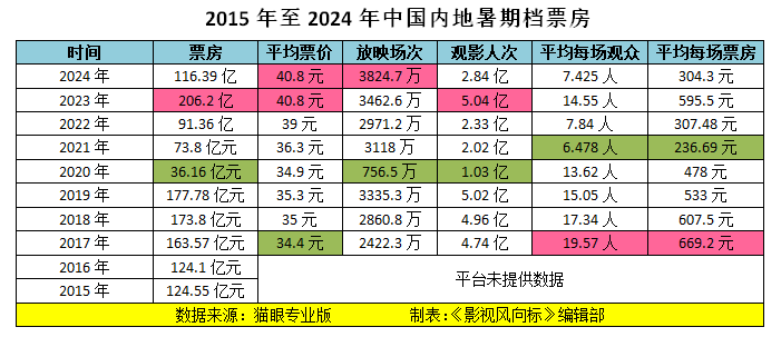 今年暑期档总观影人次2.84亿,比去年同期的5.04亿少了2.2亿,自2015年至今仅比疫情三年高。放映总场次3824.7万场,创中国影史暑期档新高。平均票价40.8元,与去年同期持平,并列同档期最高。平均每场观众7.425人,平均每场票房304.3元,这两项数据仅高于2021年暑期档。