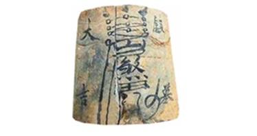 有的地方还有放镇墓瓦的风俗,用小瓦一块,乾丧瓦宽头朝前,坤丧瓦窄头朝前,用毛笔蘸朱砂在瓦正面书写“镇墓大吉”,并画符“山尸煞鬼”,保佑墓中人灵魂安生。如下图: