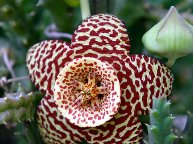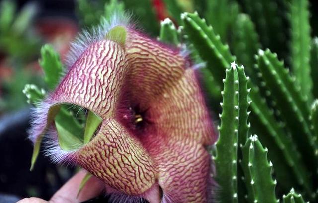 俗称臭肉花,实为萝藦科、豹皮花属肉植,植株因外观肖似金钱豹而得名。据许多花友反应,此花开放时臭味难当,令人避之不及。