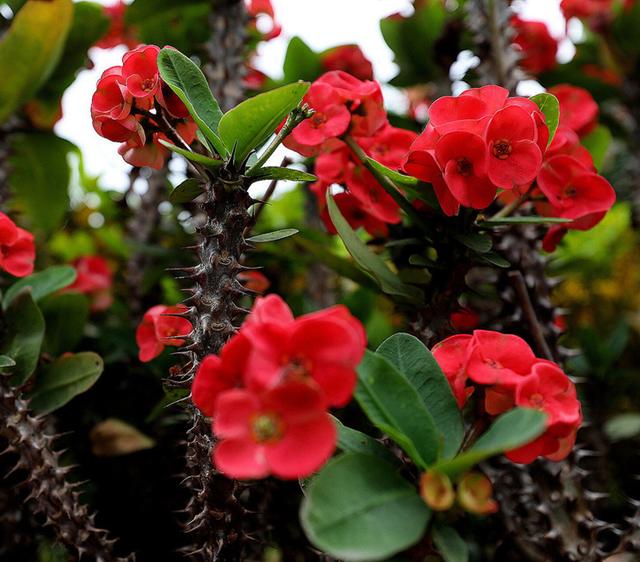 又名麒麟刺、铁海棠,同为大戟科、大戟属灌木,其与一品红的根本差别在于,它蔓生。虎刺梅原产自非洲一带,今主要分布在旧大陆的热带兼温带,我国南北方均有展开大规模栽植行动。