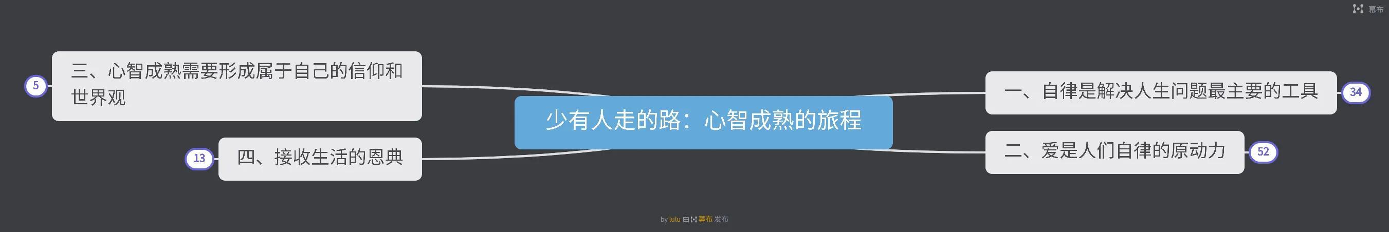 作者开篇就说了:“人生苦难重重。”是啊,人生本就是要面对很多困难,并不是一帆风顺的,通向心智成熟也是一场缓慢而艰难的旅程,当我们勇于面对自己真正的内心,敢于面对生活中的困难并去解决,心智成熟到一定阶段,我们就会更加谦逊而快乐,逐渐走上这条少有人走的路。