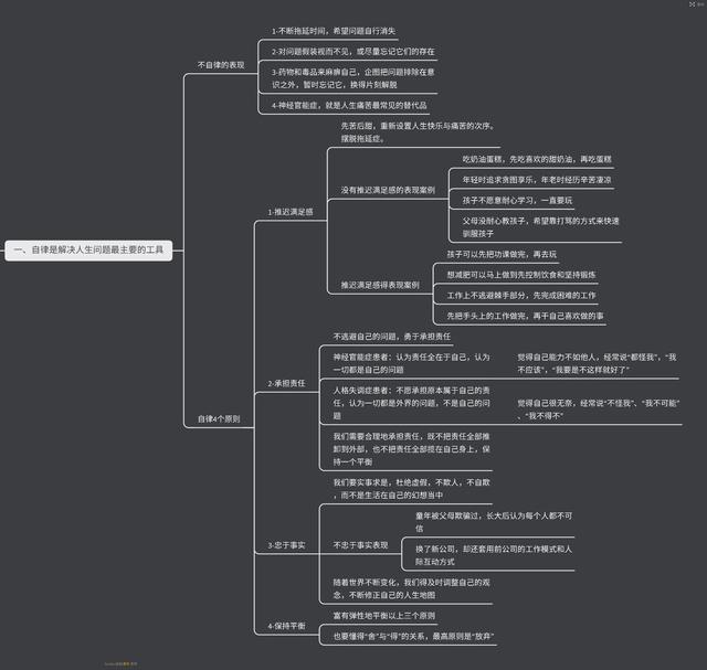 -不断拖延时间,希望问题自行消失-对问题假装视而不见,或尽量忘记它们的存在-药物和毒品来麻痹自己,企图把问题排除在意识之外,暂时忘记它,换得片刻解脱-神经官能症,就是人生痛苦最常见的替代品自律四个原则:推迟满足感、承担责任、忠于事实、保持平衡。