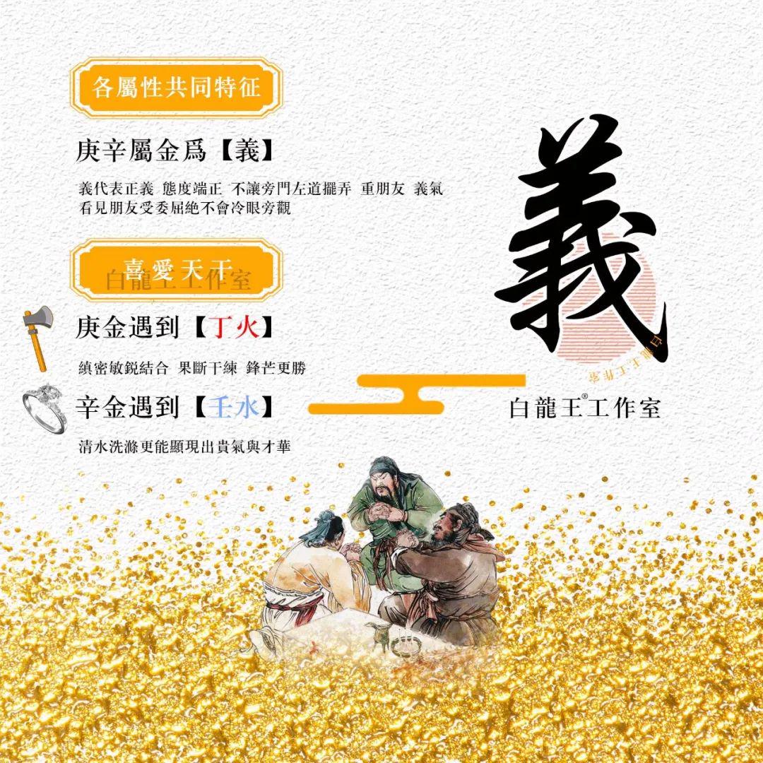 庚金是阳金,巨斧,刚健勇猛,果断犀利,喜形于色;代表义气,气魄,刚健,是非分明,家家有本正义的经;友情当前,尽所能,场场赴约,但是麻烦事找上门会先开溜;真情交流至上,极度排斥虚伪,习惯性直球对决;庚金喜丙丁火,不怕官煞,火越旺越可以打造庚金的特性,如果八字中没有火格局就低很多,除非是特殊格局,比如金白水清格,八字中只有金和水的类型,有利文章、文职相关职务。