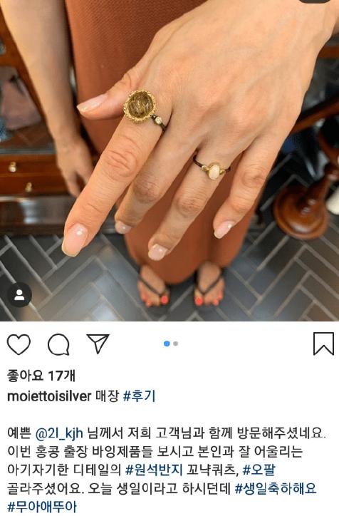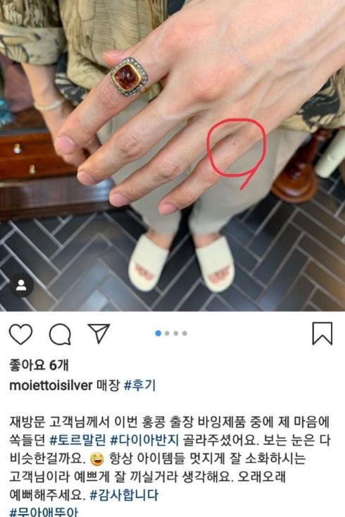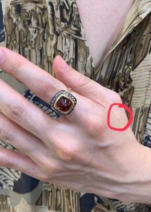 另外一张是一位男士的手,但是到底是谁的手就不得而知了。只见这位男士的手上戴着和李艾儿同款不同样的戒指。但是因为这个男士手上的痣和金材昱在同一个位置,所以引发大家猜疑这个男士是金材昱。
